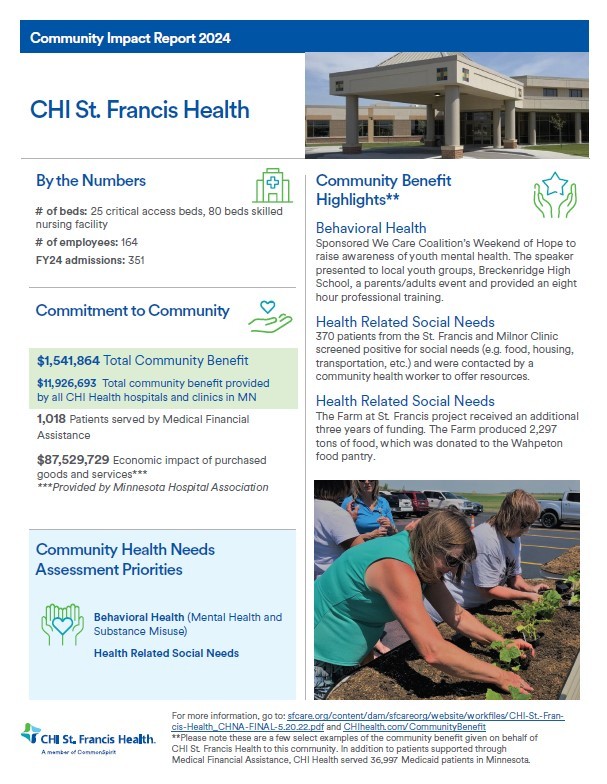 View the 2026-2028 Implementation Strategy View the 2024 CHI St. Francis Health Community Benefit Report Learn more about CommonSpirit Health Midwest Division Community Benefit |